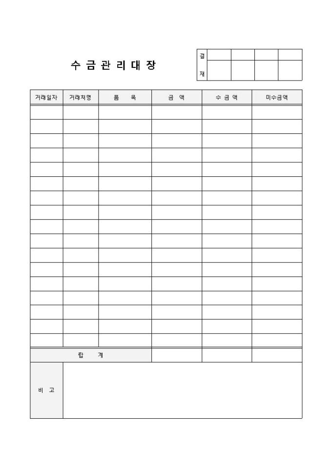 수금관리대장 입니다. 거래일자, 거래처명, 품목, 금액, 수금액 등으로 구성되었습니다. 거래일자 별 수금내역 및 특이사항 작성에 용이합니다.
