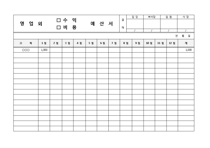 9,000원/월영업외 수익이나 비용에 대한 예산 기록 및 확인을 위해 사용되는 영업외 수익/비용 예산서 양식입니다. 결재라인과 함께 과목, 월, 합계 등의 항목으로 구성되어 있습니다.