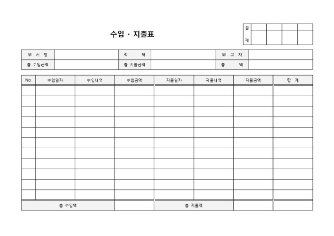 9,000원/월수입지출표 입니다. 수입일자, 수입내역, 수입금액, 지출일자 등으로 구성되었습니다. 총 수입금액 및 지출금액을 간편하게 작성할 수 있으며, 이를통해 총액 도출을 간편하게 시행할 수 있습니다.