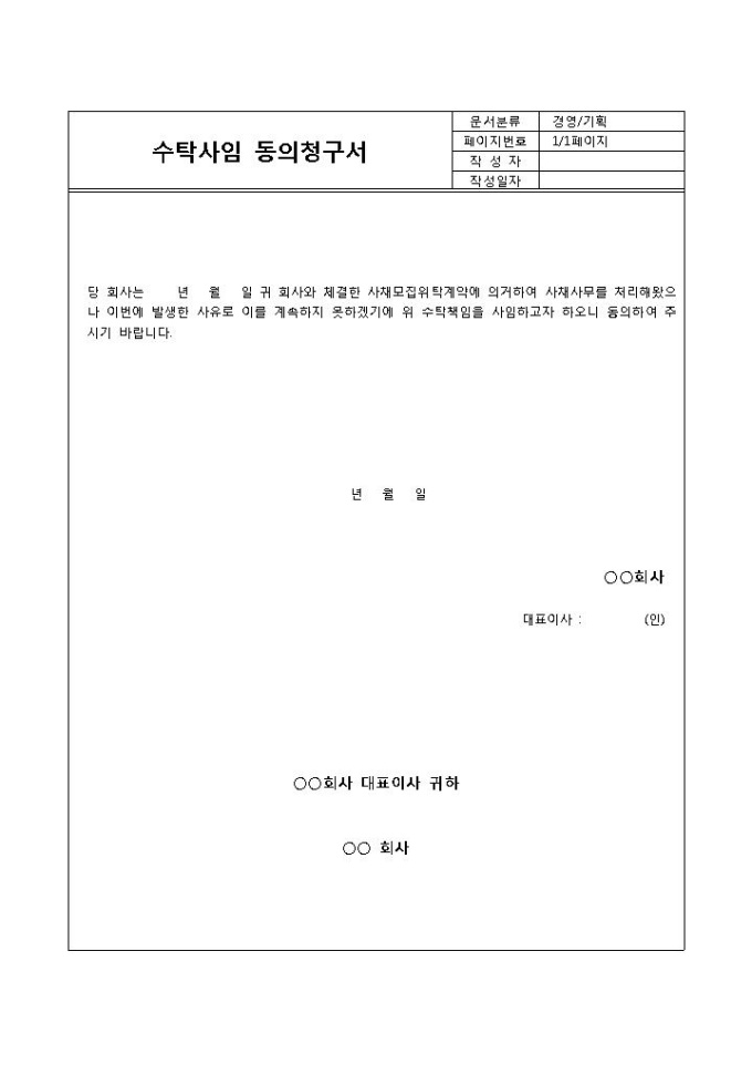 9,000원/월수탁 책임을 사임하고자 할 때 동의를 구하고자 하는 수탁사임 동의청구서 양식입니다. 날짜 및 사임 동의 요청내용, 회사명 등의 항목으로 구성되어 있습니다.