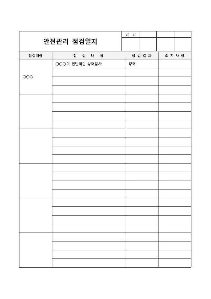 점검하고자 하는 품목을 점검함에 있어서 결과나 조치사항의 기록을 위해 사용하는 안전관리 점검일지 양식입니다. 결재라인과 함께 점검대상, 점검내용, 점검결과, 조치사항의 항목으로 구성되어 있습니다.