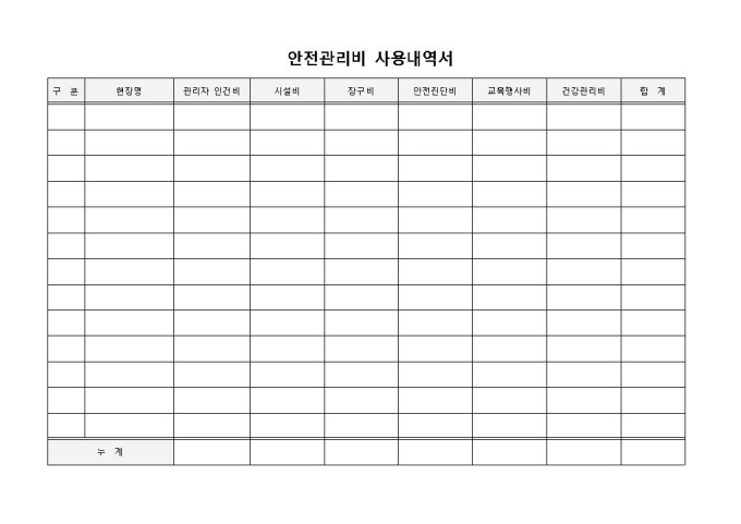 9,000원/월안전관리비사용내역서 입니다. 현장명, 인건비, 시설비, 장구비, 안전진단비, 교육행사비, 건강관리비 등으로 구성되었습니다. 각 현장별 사용내역 작성 및 금액 집계에 에 용이합니다.