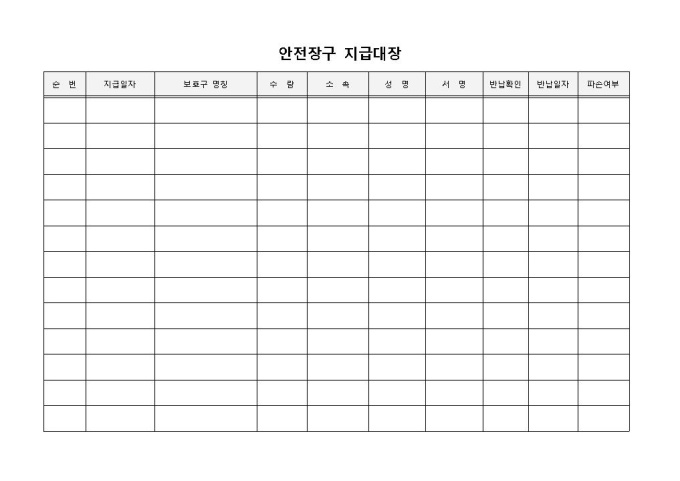 9,000원/월안전장구 지급대장 입니다. 순번, 지급일자, 보호구 명칭, 수량, 소속, 성명, 서명 등으로 구성되었습니다. 반납일자를 확인하고 그에 따른 보호구의 이상여부 파악에 효과적입니다.