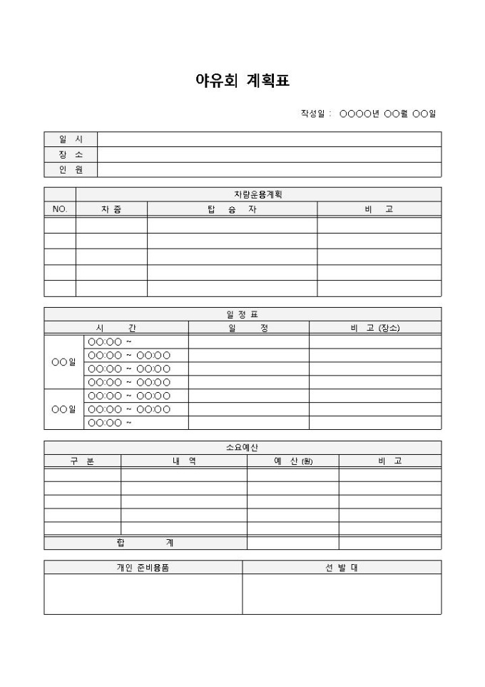9,000원/월야유회계획서 입니다. 일시, 장소, 인원, 차량운용계획, 일정표, 예산 등으로 구성되었으며, 사용자에게 정확성을 제공합니다.