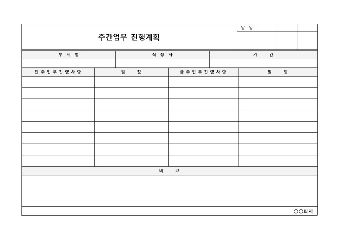 전주와 금주의 업무진행 사항 및 일정을 진행하거나 계획할 때 사용되는 주간업무 진행계획표 양식입니다. 결재라인과 함께 부서명, 작성자, 기간, 업무의 진행사항, 일정 등의 항목으로 구성되어 있습니다.