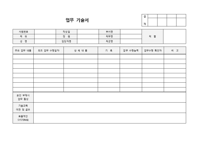 9,000원/월업무기술서 입니다. 사원번호, 직위, 성명, 작성일, 정원, 직렬, 부서명, 직무, 주요업무내용 등으로 구성되었습니다. 업무의 상세내용을 확인하고 그에 따른 수행능력 파악에 효과적입니다.