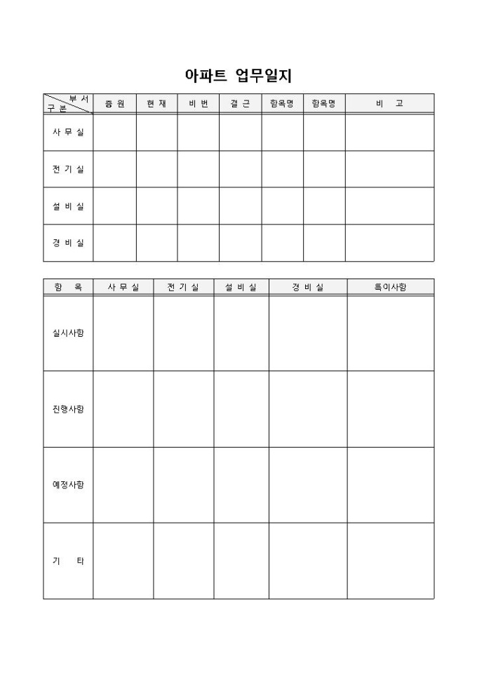 9,000원/월아파트 업무일지 입니다. 총원, 결근, 현재, 비번, 결근, 항목명 등으로 구성되었습니다. 각 업무별 실시사항 파악 및 예정사항 기입에 용이한 양식입니다.