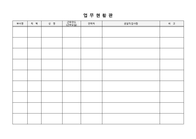 부서명, 직책, 성명, 근무코드, 연락처, 금일작업사항 등으로 구성되었습니다. 업무 작업 및 진행사항을 파악하고 정리하는데 용이합니다.