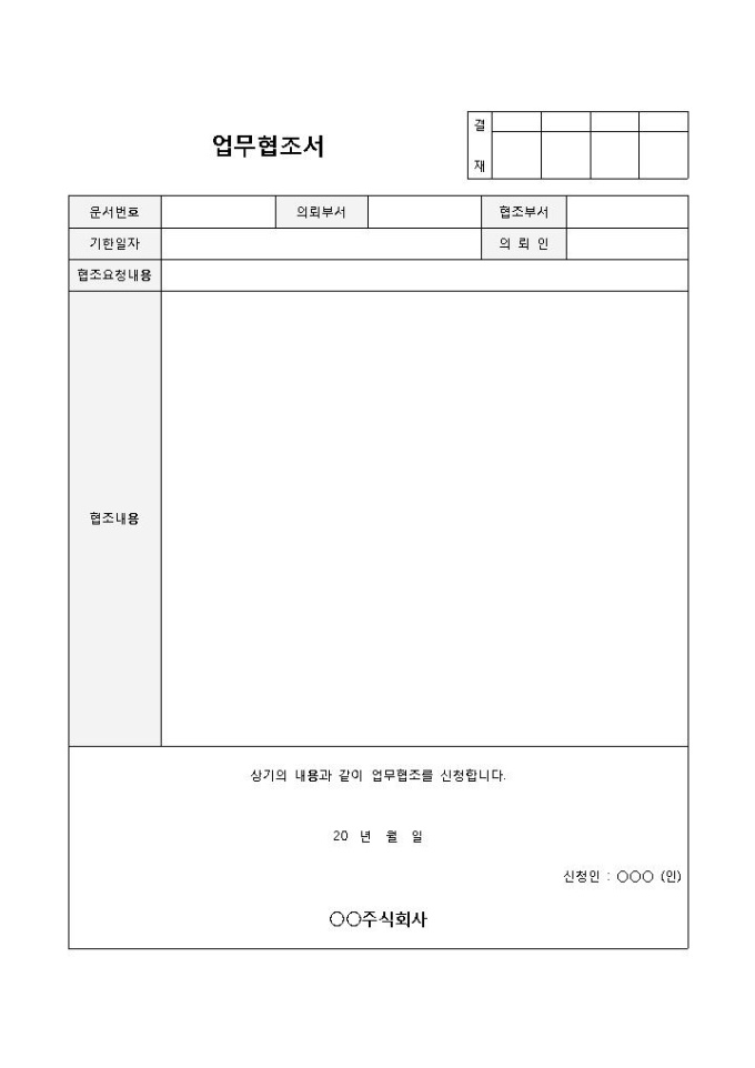9,000원/월업무협조서 입니다. 문서번호, 기한일자, 의뢰부서, 협조요청내용, 의뢰인 등으로 구성되었습니다. 협조요청내용 및 협조사항을 간편하게 작성할 수 있습니다.]
