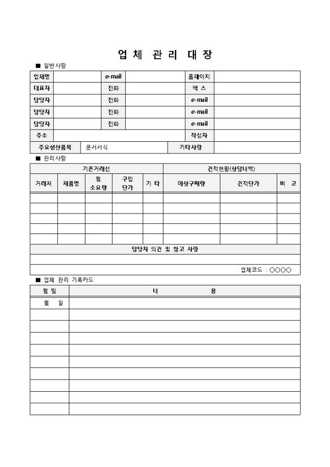 9,000원/월해당 업체 제품의 월 소요량, 구입단가, 견적 예상구매량, 단가를 관리할 때 사용되는 업체관리대장 양식입니다. 업체의 일반사항, 관리사항, 업체관리기록카드 등의 항목으로 구성되어 있습니다.