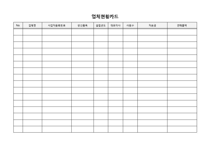 업체현황카드 입니다. 업체명, 사업자등록번호, 생산품목, 설립년도, 대표이사, 사원수, 자본금 등으로 구성되었습니다. 업체에 따른 생산품목 파악에 효과적입니다.