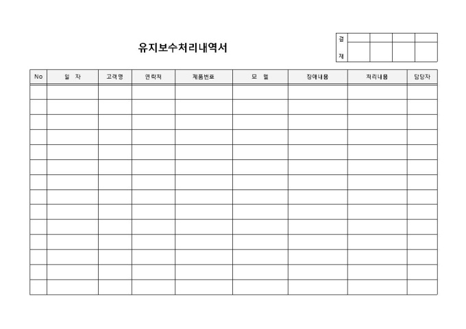 9,000원/월에어컨유지보수처리내역서 입니다. 고객명, 일자, 모델명, 처리내역 등으로 구성되었습니다. 불량사유를 파악하고 그에 따른 처리내역 작성 및 처리자 파악에 용이한 양식입니다.
