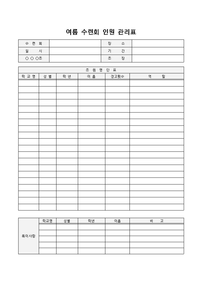 여름수련회 양식입니다. 수련회명, 장소, 기간, 조원명단표, 특이사항으로 구성되어있습니다. 조원별 명단을 작성하고 인원을 관리하는데 용이합니다.