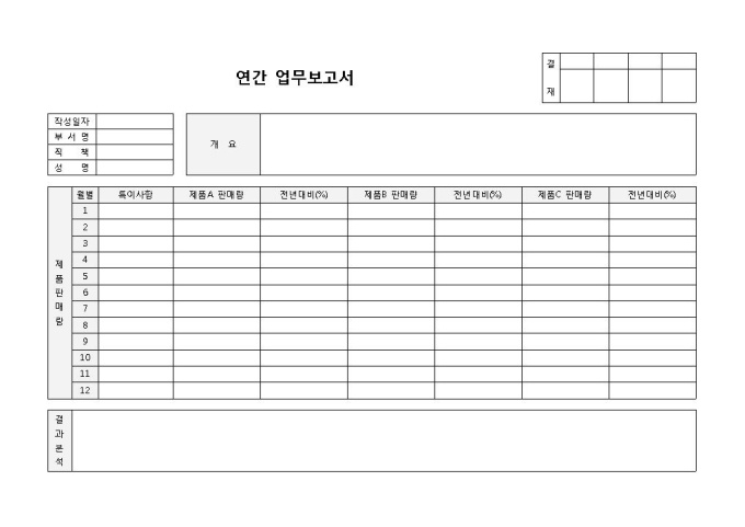 9,000원/월연간보고서 입니다. 작성일, 부서, 직책, 성명, 개요, 제품판매량, 결봐분석 등으로 구성되었으며, 세부적인 사항까지 기입할 수 있습니다.