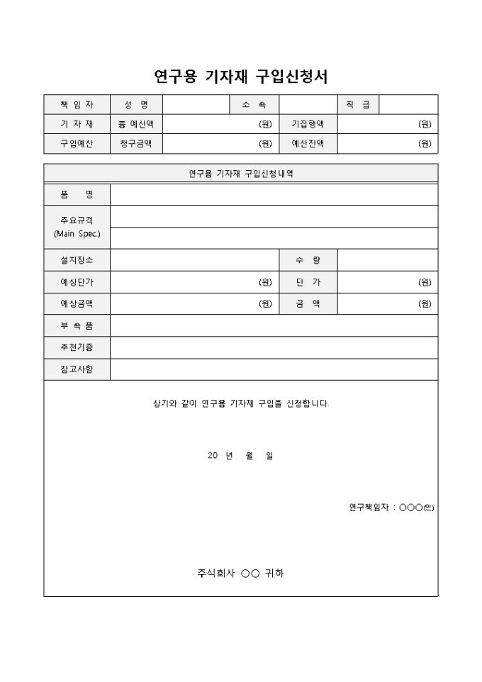 9,000원/월연구기자재 구입신청서 입니다. 연구책임자, 연구용가자재, 구입예산 등으로 구성되었으며, 단가파악 및 금액계산에 용이합니다.