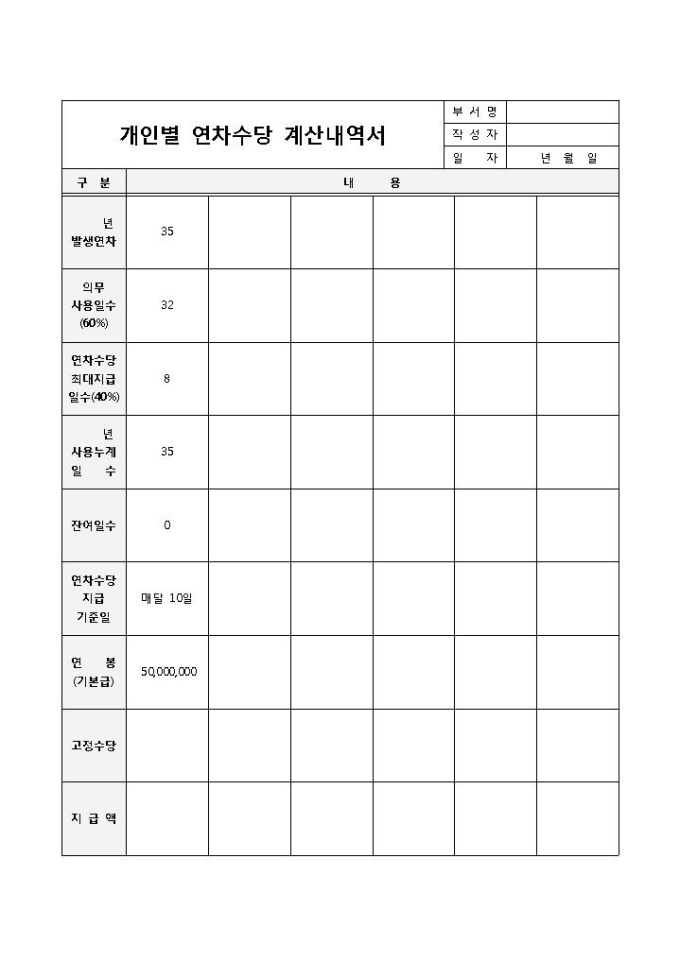 9,000원/월개인별 연차수당의 일수 및 연봉을 고려하여 계산할 때 사용하는 연차수당 계산내역서 양식입니다. 발생연차, 사용일수, 잔여일수, 연차수당지급일 등의 항목으로 구성되어 있습니다.