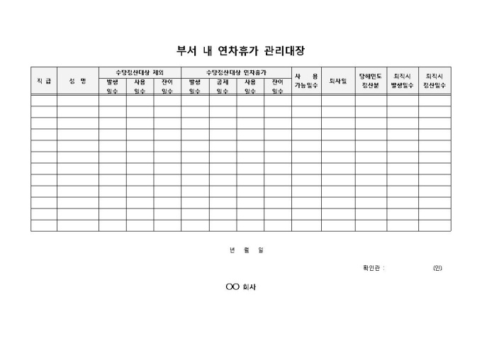 부서 내에서 연차나 휴가의 관리를 기록할 때 사용되는 연차, 휴가 관리대장 양식입니다. 직급, 성명, 연차휴가 일수, 사용일수, 퇴사일, 퇴직 시 발생일수 등의 항목으로 구성되어 있습니다.