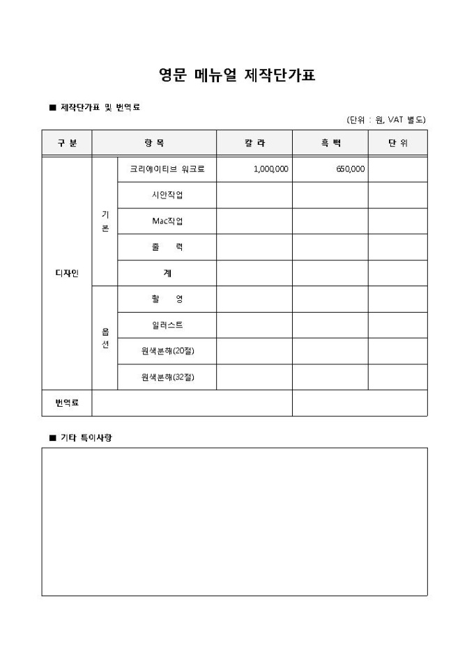 9,000원/월영문으로 제작되는 매뉴얼에 대한 단가를 기록하고 통계할 때 사용되는 영문 매뉴얼 제작단가표 양식입니다. 제작단가표 및 번역료, 칼라 및 흑백별 가격, 기타 특이사항 등의 항목으로 구성되어 있습니다.