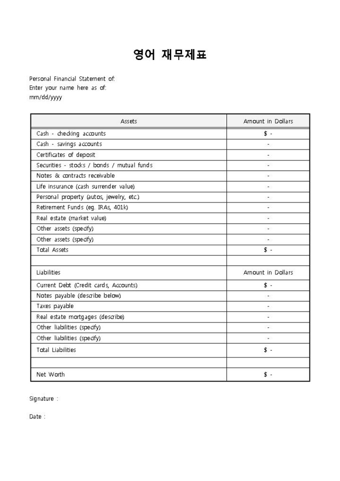9,000원/월영어 재무제표입니다. Assets, Amount in Dollars 등으로 구성되어 있습니다. 영어로 되어진 재무제표를 작성할 때 사용할 수 있습니다.
