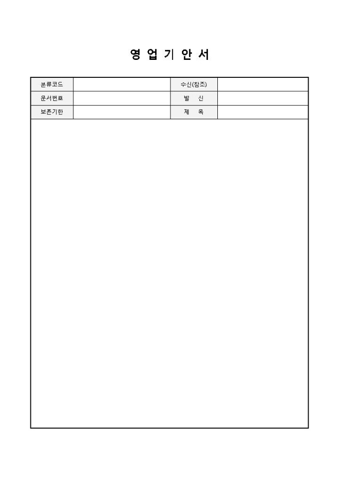 영업기안서입니다. 분류코드, 수신, 문서번호, 발신, 보존기한, 제목으로 구성되어 있습니다. 밑에 넓은 칸으로 구성되어 있어 인쇄 후 영업기안서를 직접 손으로 작성하여 사용할 수 있습니다.