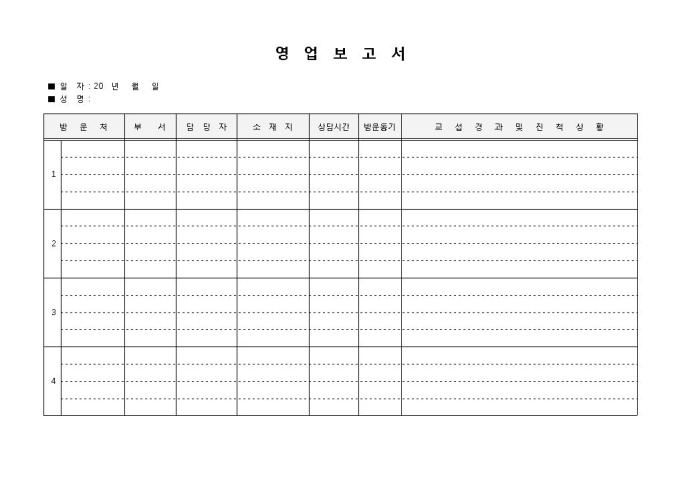 영업보고서입니다. 방문처, 부서, 담당자, 소재지, 상담시간, 방문동기, 교섭경과 및 진척상황 등의 항목으로 구성되어 있습니다. 일일, 주간, 월간 영업보고서 작성 시 활용 할 수 있습니다.