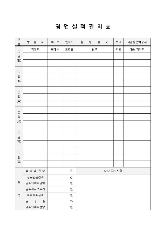 9,000원/월영업실적관리표입니다. 구분, 방문처, 부서, 면회자, 활동결과, 보고, 다음방문예정지 등으로 구성되어 있습니다. 기업에서 영업에 대한 실적을 관리할 때 표로 작성하여 사용할 수 있습니다.