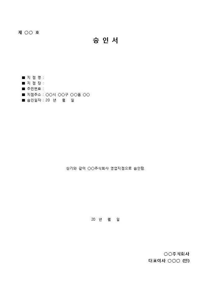 9,000원/월영업 지점으로 승인한다는 사실을 증명할 때 사용되는 영업지점 승인 인증서 양식입니다. 지점명, 지점장, 주민번호, 지점주소, 승인일자 등의 항목으로 구성되어 있습니다.