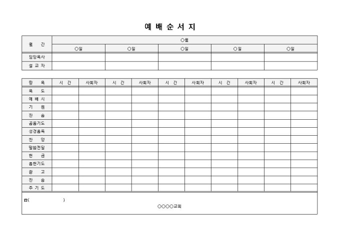 9,000원/월예배순서지 입니다. 사회자, 설교자 등으로 구성되었습니다. 묵도, 예배시, 기원, 찬송, 공동기도 등으로 구성되었습니다. 예배 시간을 확인하고 그에 따른 사회자 작성에 효과적입니다.