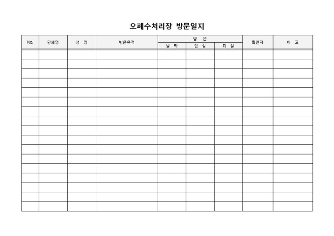 오폐수처리장 방문일지 입니다. 단체명, 성명, 방문목적, 방문일, 입실, 퇴실 시간 등으로 구성되었습니다. 방문인원의 소속사항 및 방문사유를 간편하게 작성할 수 있습니다. 비고란을 통해 명시되지 않은 사항을 추가로 기입할 수 있습니다.