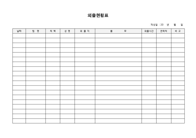 9,000원/월외출현황표입니다. 날짜, 팀명, 직책, 성명, 외출지, 용무, 외출시간 등의 항목으로 구성되어 있습니다. 기본적인 외출현황표 양식입니다.