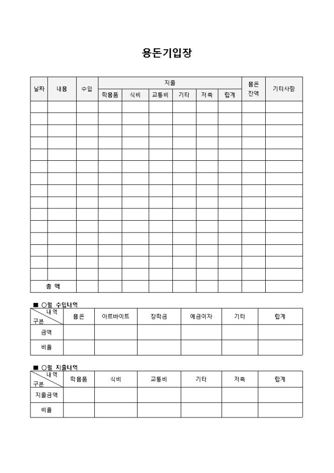 9,000원/월용돈기입장입니다. 내용, 수입, 지출, 월수입내역, 월지출내역 등의 항목으로 구성되어 있습니다. 지출과 수입내역을 세부적으로 기록할 수 있는 용돈기입장양식입니다.