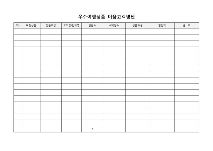 우수여행상품 이용고객명단 입니다. 여행상품, 고객명/단체명, 인원수, 숙박일수 등으로 구성되었습니다. 상품요금 및 할인액을 계산에 효과적입니다.