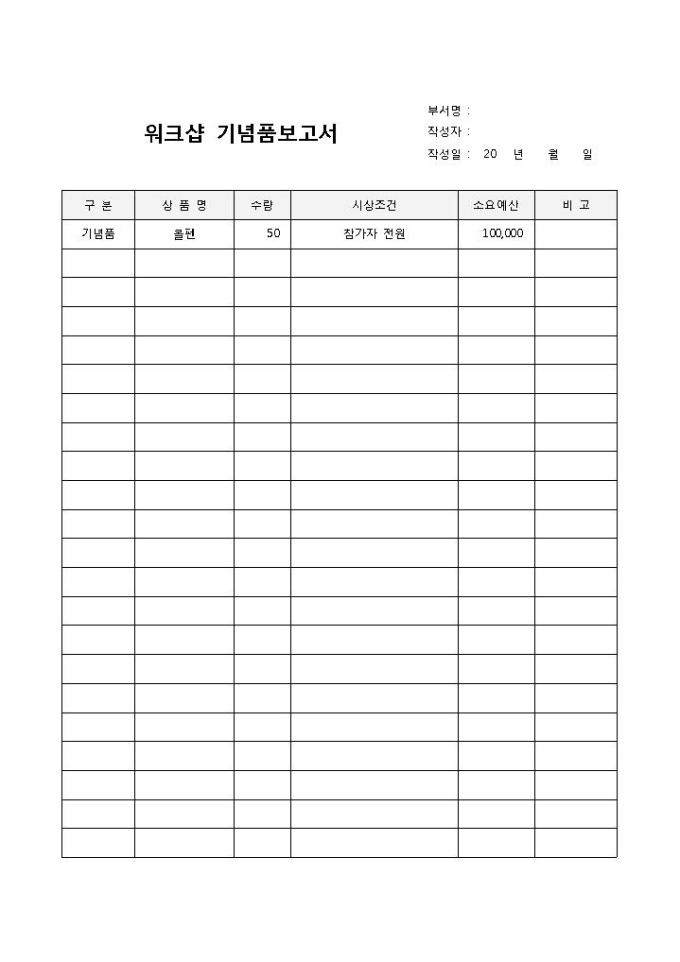 9,000원/월워크샵보고서(기념품)입니다. 구분, 상품명, 수량, 시상조건, 소요예산 등의 항목으로 구성되어 있습니다. 워크샵에 사용된 기념품에 대해 보고시 사용할 수 있는 양식입니다.