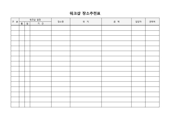 9,000원/월워크샵장소추천표 입니다. 워크샵 일정, 장소명, 위치, 수용 인원수 등으로 구성되었습니다. 이용금액을 파악하고 업체관리자 확인에 용이합니다.