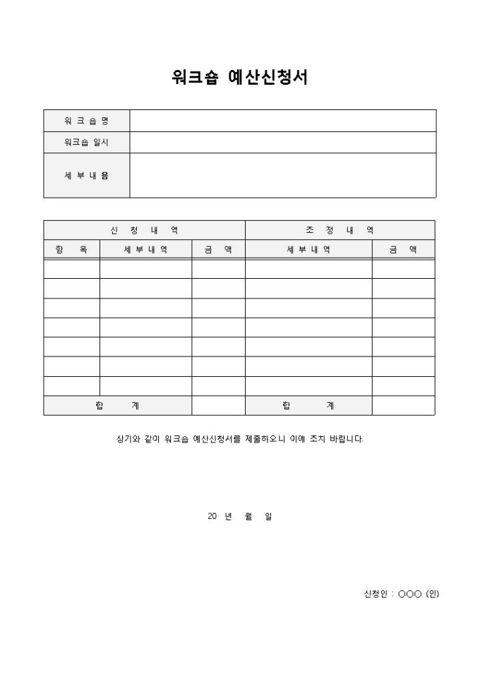 9,000원/월워크숍 예산신청서입니다. 워크숍명, 워크숍 일시, 세부 내용, 신청내역, 항목, 세부내역, 금액, 조청내역의 세부내역, 금액 등으로 구성되어 있습니다. 부서에서 워크숍에 대한 예산신청서와 이에 대한 조치를 바랄 때 작성하여 사용할 수 있습니다.