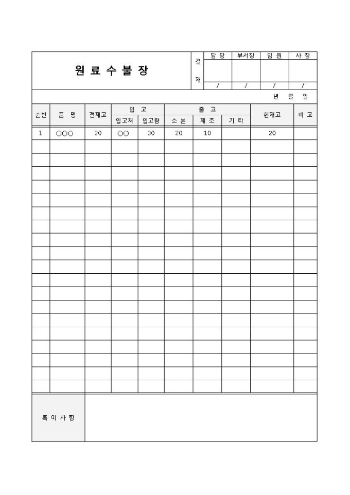 9,000원/월원료의 보유량과 입고 및 출고 등의 내용을 기록하고 관리할 때 사용되는 원료수불장 양식입니다. 품명, 전 재고, 입고, 출고, 현재고, 특이사항 등의 항목으로 구성되어 있습니다.