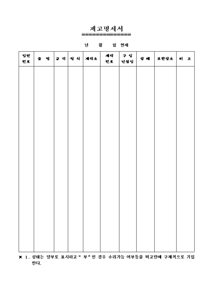 보유하고 있는 물품의 규격, 형식, 제작소, 보관장소 등을 기록하는 양식입니다.