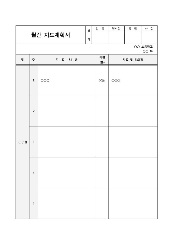 일반적으로 학교 현장에 있는 교사나 교수가 수업을 계획하거나, 학생을 월간의 형태로 지도하기 위해서 사용되는 월간 지도계획서 양식입니다. 월, 주, 지도내용, 시량(분), 자료 및 유의점 등의 항목으로 구성되어 있습니다.