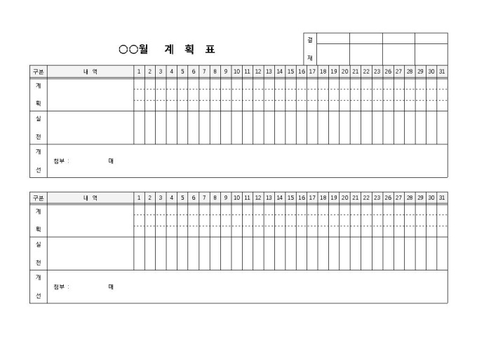 월계획표입니다. 일자별로 월 계획, 실천, 개선사항을 작성할 수 있도록 구성되어 있습니다. 일자별로 계획에 대한 확인이 가능합니다.