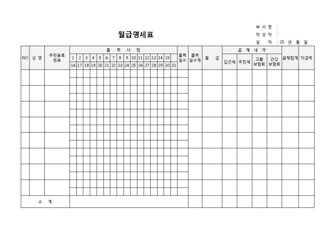 월급명세표입니다. 성명, 출력사항, 출력일수, 출력일수계, 월급, 공제내역, 공제합계, 지급액 등의 항목으로 구성되어 있습니다.