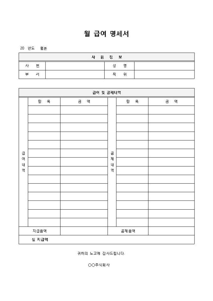 월급여명세서입니다. 사원정보, 급여 및 공제내역 등의 항목으로 구성되어 있습니다.