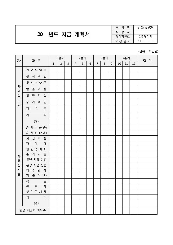 9,000원/월월자금계획서입니다. 자금의 수입, 자금의 지출, 분기, 합계 등의 항목으로 구성되어 있습니다.