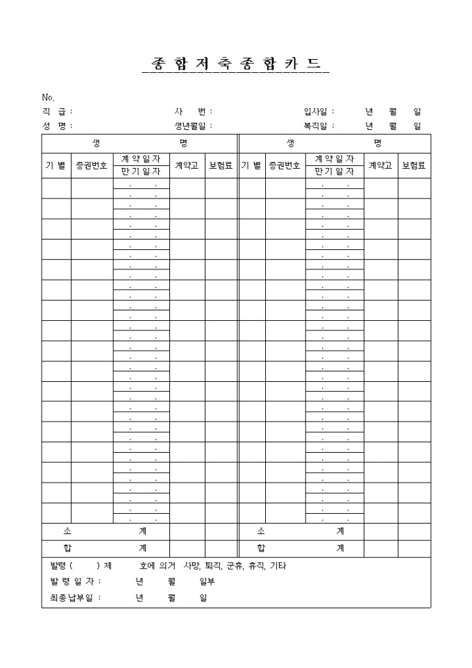 기별, 증권번호, 계약(만기)일자, 계약고, 보혐료 등을 기록하는 종합저축종합카드 양식입니다.