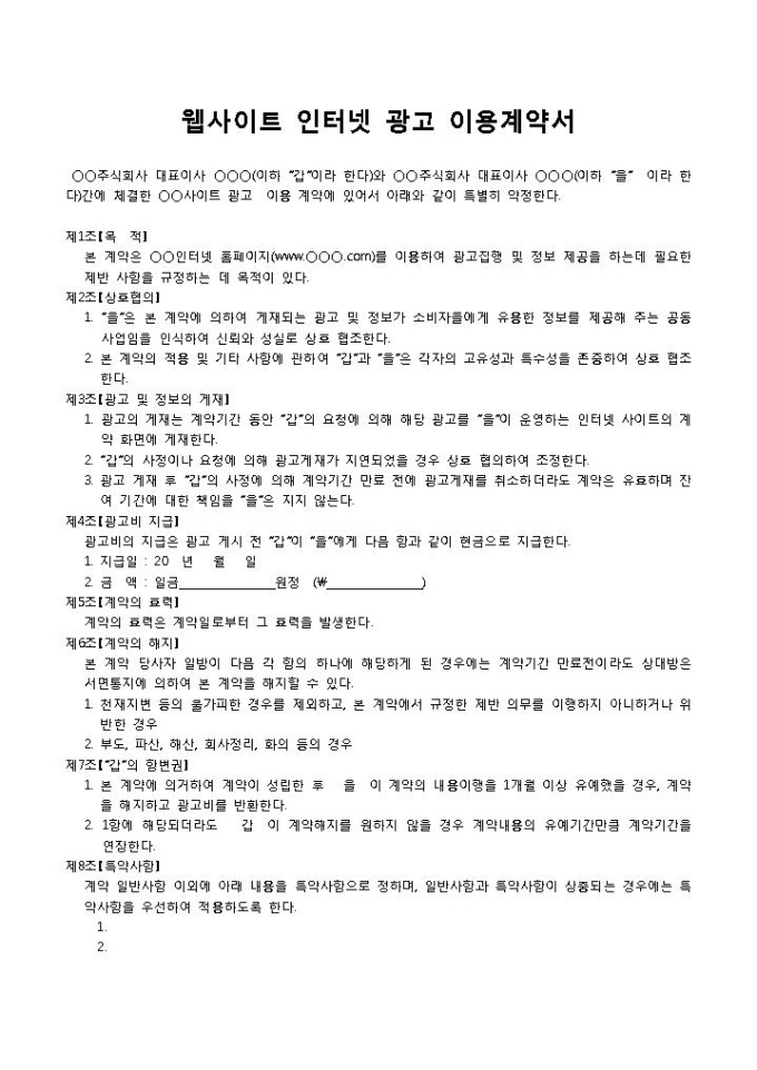 9,000원/월웹사이트 인터넷 광고 이용계약서입니다. 웹사이트에 대한 인터넷 광고 이용 계약 내용으로 구성되어 있습니다. 주식회사 대표이사와 주식회사 대표이사 상호간에 사이트 광고 이용 계약을 특별히 약정할 때 계약서로 작성하여 사용할 수 있습니다.