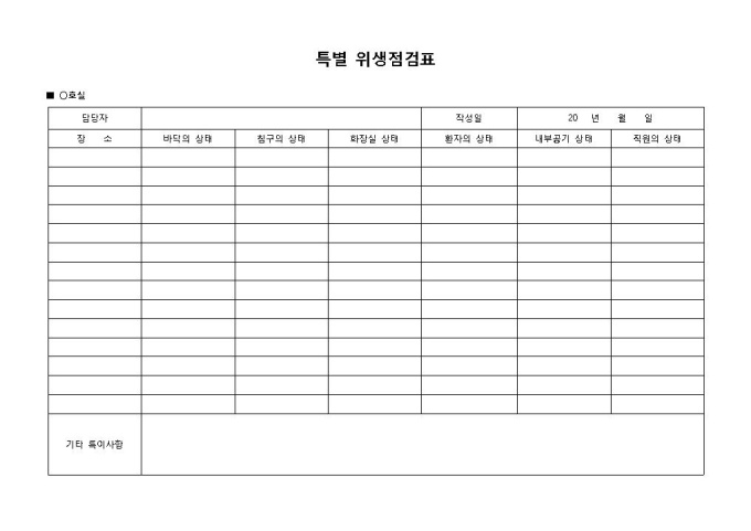 9,000원/월위생점검표(특별)입니다. 담당자, 장소, 바닥의 상태, 침구의 상태, 화장실 상태, 환자의 상태, 내부공기상태 등의 항목으로 구성되어 있습니다. 병원이나 요양시설에서 위생 점검시 사용 할 수 있는 위생점검표양식입니다.