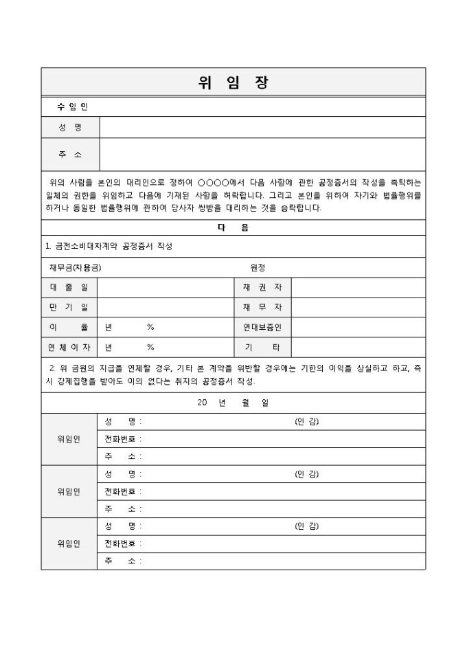9,000원/월위임장공증입니다. 수임인, 성명, 주소, 금전소비대차계약 공정증서 작성, 위임인 등의 항목으로 구성되어 있습니다.