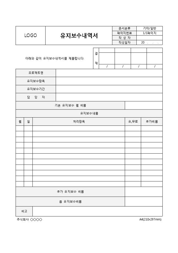 유지보수내역서(기본)입니다. 프로젝트명, 유지보수항목, 유지보수기간, 담당자, 기본 유지보수 월 비용, 유지보수내용 등의 항목으로 구성되어 있습니다.