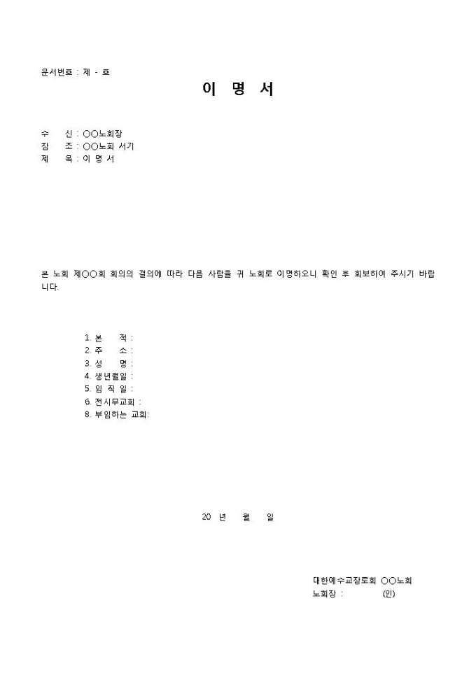 9,000원/월이명서 입니다. 수신, 참조, 제목, 내용 등으로 구성되었습니다. 이명자의 신상명세 및 부임교회기입에 용이합니다.