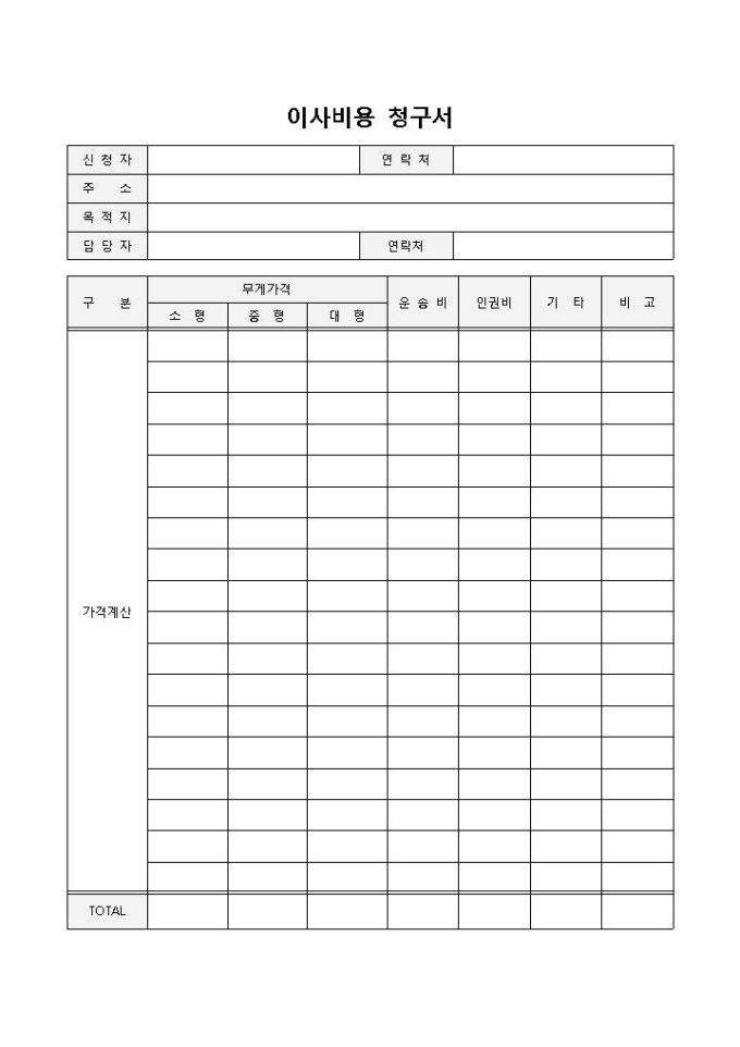 9,000원/월이사비용청구서 입니다. 신청자, 주소, 연락처, 담당자, 목적지 등으로 구성되었습니다. 이삿짐 무게별 견적 작성에 용이합니다.