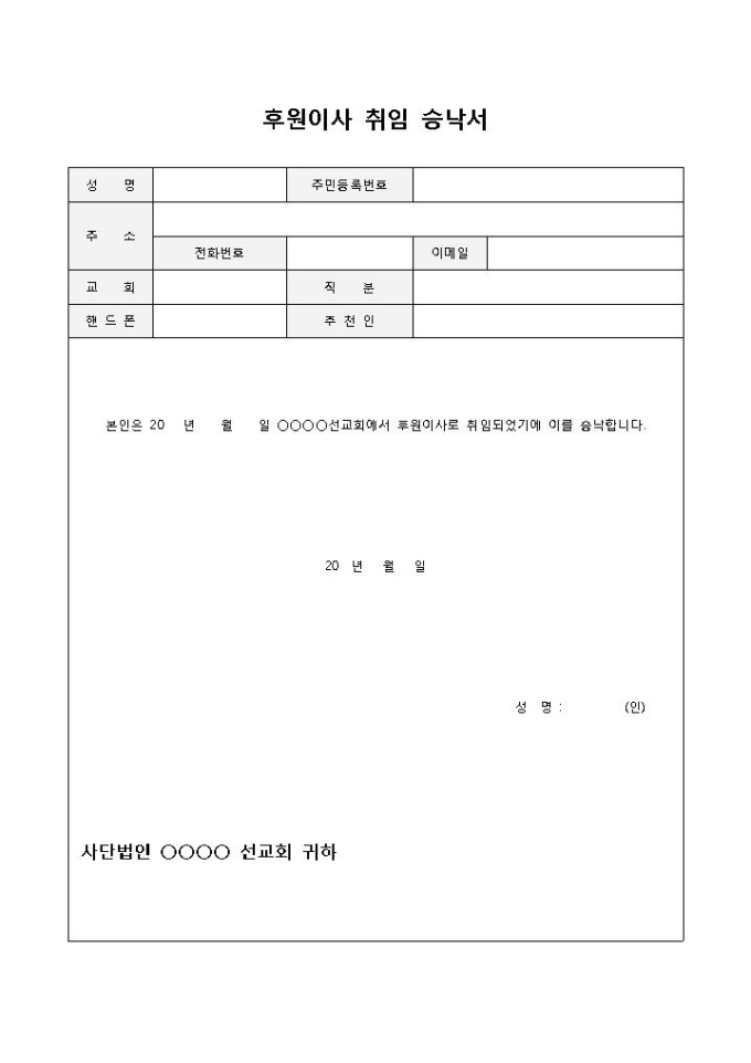 9,000원/월이사취임승낙서(후원이사)입니다. 이사의 인적사항, 추천인 등의 항목으로 구성되어 있습니다. 교회에서 후원이사에 대해 취임 승낙시 사용할 수 있는 양식입니다.